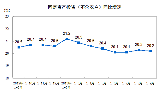 核心提示:2013年1-9月份固定資產(chǎn)投資(不含農(nóng)戶)主要數(shù)據(jù)2013年1-9月份,全國(guó)固定資產(chǎn)投資(不含農(nóng)戶)309208億元,同比名義增長(zhǎng)20.2%(扣除價(jià)格因素實(shí)際增長(zhǎng)20.2%),增速比1-8月份回落0.1個(gè)百分點(diǎn)。從環(huán)比看,9月份固定資產(chǎn)投資(不含農(nóng)戶)增長(zhǎng)1.28%。