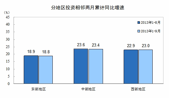 分地區(qū)看,1-9月份,東部地區(qū)投資144646億元,同比增長(zhǎng)18.8%,增速比1-8月份回落0.1個(gè)百分點(diǎn);中部地區(qū)投資86800億元,增長(zhǎng)23.4%,增速回落0.2個(gè)百分點(diǎn);西部地區(qū)投資75919億元,增長(zhǎng)23%,增速加快0.1個(gè)百分點(diǎn)。