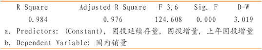 模型3 的樣本數量為N=10, adjusted R2=0.976, F 3,6=124.608,基本上都能令人滿意,但是D-W=3.019,表明此模型存在較嚴重的負自相關