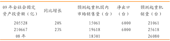 按09 年全社會固定資產投資20.55 萬億計算,09 年輪式起重機的銷量15061臺,比08 年18301 臺,下降約17.7%,如果出口能維持6000 臺(08 年7800臺),那么總銷量約21061 臺,約下降19%左右。