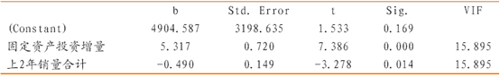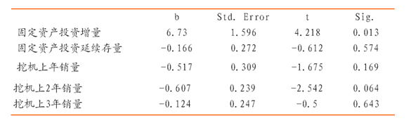 這個模型的樣本數量為9,F=131, F.sig=0.000。固定資產投資延續存量和挖掘機上1、2、3 的銷量的系數估計值的t-stat 并不顯著。
