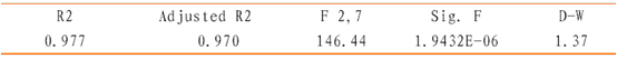 模型2的樣本數量N=10, F2,7 =146.44, Sig.F 非常顯著, D-W=1.37 表明自相關水平不是很高,還是可以接受。