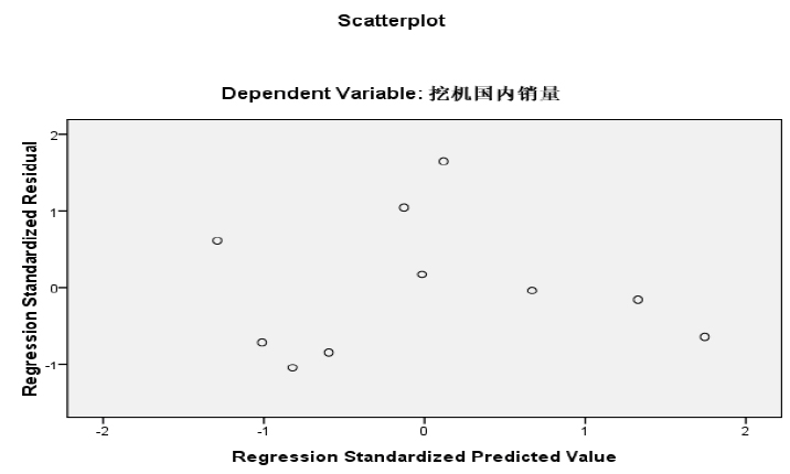 上面模型的固定資產投資增量和上2 年挖機合計銷量的t-stat 較為顯著,Sig 很低, 常量系數的t 不是很顯著,雙向Sig level=16.9%, 但仍然可以接受, 尤其是在如此低的樣本數量情況下。 VIF 的水平適度,說明模型4存在一定的多重線性相關(multicollinearity),但我們認為這樣程度的多重線性相關還是可以接受。雖然去除一個自變量可以減少多重線性相關性,但這樣一來經濟學上的意義就大大下降了。 我們認為為了統計學的完美而完全破壞模型的經濟學意義是得不償失的。