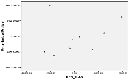 D-W test=1.37, 說明自相關性存在但并非很嚴重。我們通過圖點分析,可以看出自相關性并非很嚴重。同時我們還做了殘差的一階自相關回歸,但是回歸系數的t-sig level 達到46.3%,說明自相關并不是非常嚴重,我們無太大必要對模型的自相關進行補救。