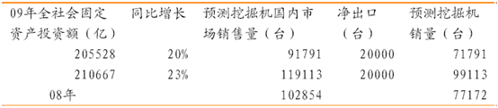 按照09 年固定資產投資20.55 萬億計算,09 年挖掘機國內銷量應該為91791臺, 比08 年102854 臺下降10.28%。 08 年的挖掘機凈進口量25682 臺,如果09 年能下降到20000 臺左右,那么09 年挖掘機國產產量可達到71791 臺,比09 年的國內挖掘機產量77172 臺下降10.61%。