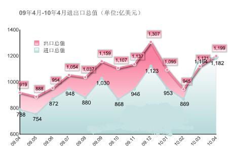 其中,出口額為1199.2億美元,增長30.5%;進口額為1182.4億美元,增長49.7%,前四月進出口總值8559.9億美元,同比增長42.7%。貿易順差為161.1億美元,下降78.6%。