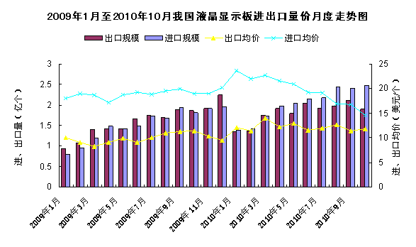核心提示:2010年前10月中國進口液晶顯示板20.2億個據海關統計:2010年前10個月中國進口液晶顯示板20.2億個,比去年同期增長(下同)39.1%;價值388.7億美元,增長42%,進口平均價格為每個19.3美元,上漲2%。同期,出口18.1億個,增長20.2%;價值221.4億美元,增長46.4%,出口平均價格為每個12.2美元,上漲21.8%。2010年前10個月我國液晶顯示板進出口的主要特點
