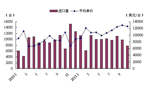 2011年1~10月,我國累計進口金屬加工機床9.85萬臺,比2010年同期的8.62萬臺增長了14.3%;進口金額為108.93億美元,比2010年同期的72.81億美元增長了49.6%;平均進口單價為11.06萬美元/臺,比2010年同期的8.47萬美元/臺增長了30.9%。