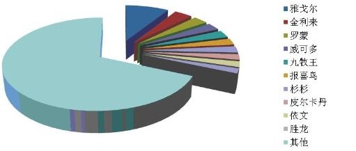 2013年6月份全國重點大型零售企業男西裝銷售前十位品牌市場份額合計為31.5%,其中雅戈爾繼續占據榜首位置,金利來和羅蒙分列第二和第三位。