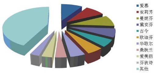 2013年6月份全國重點大型零售企業女裝銷售前十位品牌市場份額合計為24.9%,VERO MODA、ONLY和哥弟占據前三位。