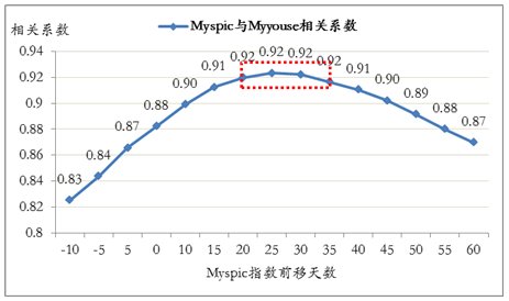 基于此,我們用Excel對兩者進(jìn)行相關(guān)性分析,相關(guān)性變化如圖表2所示。可以看出,同樣的時間點,兩者的相關(guān)系數(shù)為0.88,而將Myspic指數(shù)前移1個月左右的相關(guān)系數(shù)達(dá)到最大值0.92,即Myyouse指數(shù)領(lǐng)先于Myspic指數(shù)1個月左右。