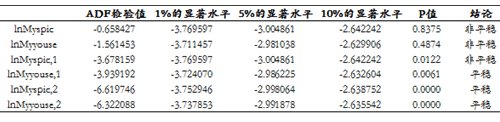 為便于進(jìn)行計量檢驗,本文對各變量序列做對數(shù)處理,鋼材價格和有色價格的對數(shù)序列分別記做lnMyspic和lnMyyouse。再利用計量經(jīng)濟(jì)學(xué)軟件,通過ADF檢驗法對各變量序列進(jìn)行平穩(wěn)性檢驗。