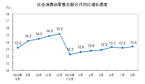 核心提示:2013年8月份社會消費品零售總額18886億元限額以上企業(單位)消費品零售額9490億元,增長11.5%。1-8月份,社會消費品零售總額148164億元,同比增長12.8%。