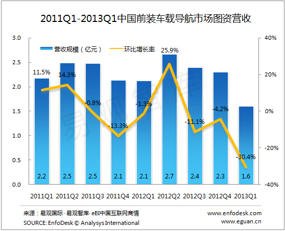 根據EnfoDesk易觀智庫產業數據庫近期發布的《2013年第1季度中國前裝車載導航市場季度監測報告》研究顯示:第1季度,中國前裝車載導航市場圖資營收規模為1.6億元人民幣,環比下降30.4%。
