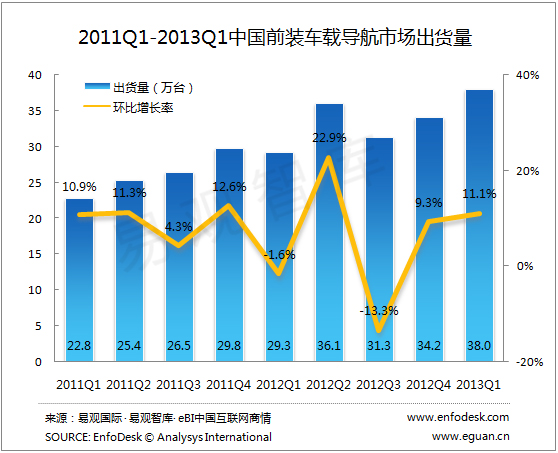 核心提示:2013年第1季度前裝車載導航出貨量38萬根據EnfoDesk易觀智庫產業數據庫近期發布的《2013年第1季度中國前裝車載導航市場季度監測報告》研究顯示:2013年第1季度,中國前裝車載導航環比上季度增長11.1%,當季出貨量為38萬臺。