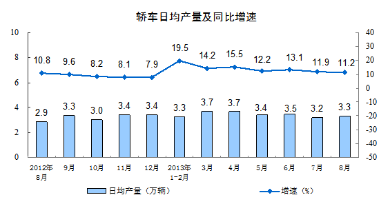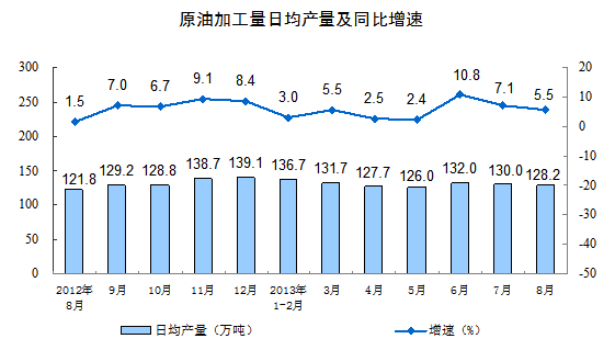 分產(chǎn)品看,8月份,464種產(chǎn)品中有305種產(chǎn)品同比增長(zhǎng)。其中,發(fā)電量4987億千瓦時(shí),同比增長(zhǎng)13.4%;鋼材9194萬噸,增長(zhǎng)15.6%;水泥21484萬噸,增長(zhǎng)8.2%;原油加工量3974萬噸,增長(zhǎng)5.5%;十種有色金屬337萬噸,增長(zhǎng)5.7%;乙烯126萬噸,增長(zhǎng)7.7%;汽車179.6萬輛,增長(zhǎng)14.8%;轎車102.3萬輛,增長(zhǎng)11.2%。