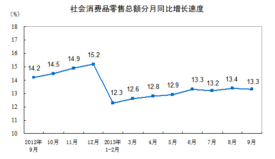 9月份社會消費品零售總額20653億元 同比增長13.3%