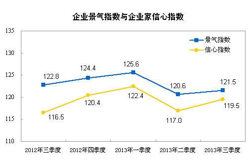 核心提示:2013年三季度企業景氣指數為121.52013年三季度企業景氣指數為121.5,比二季度高0.9點,繼續運行在景氣區間。其中,反映企業當前景氣狀態的即期企業景氣指數為117.9,反映企業未來景氣預判的預期企業景氣指數為123.9,均比二季度高0.9點。三季度,企業家信心指數為119.5,比二季度高2.5點。