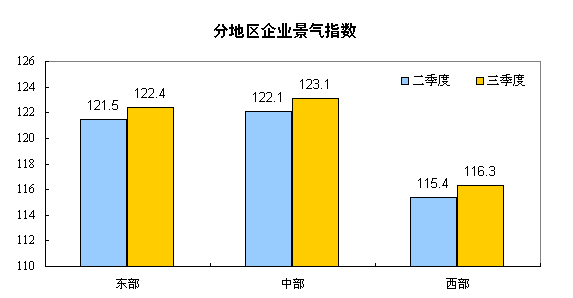 分地區看,東、中、西部地區的企業景氣指數分別為122.4、123.1、116.3,分別比二季度上升0.9、1.0、0.9點。