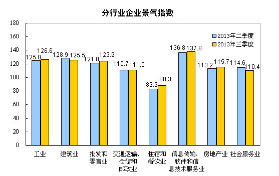 分行業看,按企業景氣指數高低排序依次是信息傳輸軟件和信息技術服務業、工業、建筑業、批發和零售業、房地產業、交通運輸倉儲和郵政業、社會服務業、住宿和餐飲業,三季度企業景氣指數依次為137.8、126.6、125.5、123.9、115.7、111.0、110.4、88.3,除住宿和餐飲業外,其他行業均處在景氣臨界值以上。