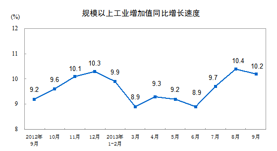 核心提示:2013年9月份規(guī)模以上工業(yè)生產(chǎn)主要數(shù)據(jù)2013年9月份,規(guī)模以上工業(yè)增加值同比實際增長10.2 %(以下增加值增速均為扣除價格因素的實際增長率),比8月份回落0.2個百分點。從環(huán)比看,9月份,規(guī)模以上工業(yè)增加值比上月增長0.72%。1-9月,規(guī)模以上工業(yè)增加值同比增長9.6%。