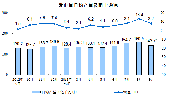 分產(chǎn)品看,9月份,464種產(chǎn)品中有304種產(chǎn)品同比增長。其中,發(fā)電量4310億千瓦時,同比增長8.2%;鋼材9355萬噸,增長15.5%;水泥22505萬噸,增長6.4%;十種有色金屬345萬噸,增長10.1%;乙烯127萬噸,增長13.7%;汽車207.3萬輛,增長17.5%;轎車113.8萬輛,增長10.4%;原油加工量3865萬噸,下降1.2%。