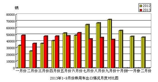 2013年1-9月份,乘用車累計出口41.05萬輛,比去年同期下降了6.59%;累計創匯金額30.04億美元,比去年同期下降了6.11%。其中:小轎車產品累計出口31.67萬輛,比去年同期下降了13.78%;累計創匯金額23.03億美元,比去年同期下降了13.37%。