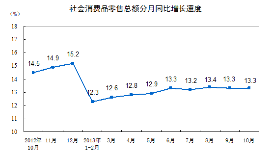 2013年10月份社會(huì)消費(fèi)品零售總額增長13.3%