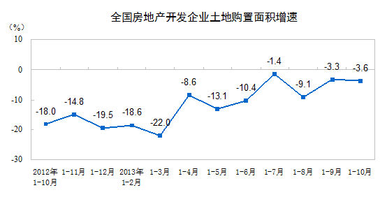 1-10月份,房地產(chǎn)開發(fā)企業(yè)土地購置面積26658萬平方米,同比下降3.6%,降幅比1-9月份擴大0.3個百分點;土地成交價款6434億元,增長11.7%,增速回落2.9個百分點。