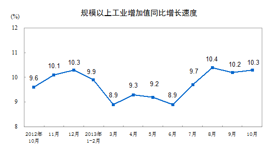 核心提示:2013年10月份規模以上工業增加值增長10.3%