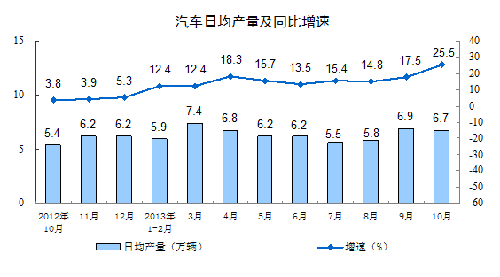 分行業看,10月份,41個大類行業中有40個行業增加值保持同比增長。其中,紡織業增長7.8%,化學原料和化學制品制造業增長12.5%,非金屬礦物制品業增長11.8%,黑色金屬冶煉和壓延加工業增長9.9%,通用設備制造業增長9.7%,汽車制造業增長18.2%,鐵路、船舶、航空航天和其他運輸設備制造業增長8.7%,電氣機械和器材制造業增長11.8%,計算機、通信和其他電子設備制造業增長11.8%,電力、熱力生產和供應業增長6.6%。