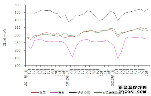 1-10月份,化學(xué)原料制品、非金屬礦物制品、黑色金屬冶煉、有色金屬冶煉四大高載能行業(yè)用電量合計(jì)13630億千瓦時(shí),同比增長 5.6%;合計(jì)用電量占全社會(huì)用電量的比重為31.1%,對(duì)全社會(huì)用電量增長的貢獻(xiàn)率為26.0%。其中,化工行業(yè)用電量3280億千瓦時(shí),同比增長5.0%;建材行業(yè)用電量2561億千瓦時(shí),同比增長5.9%;黑色金屬冶煉行業(yè)用電量4511億千瓦時(shí),同比增長6.7%;有色金屬冶煉行業(yè)3277億千瓦時(shí),同比增長4.6%。建材和鋼鐵行業(yè)用電增速分別比上年同期提高5.9和12.3個(gè)百分點(diǎn),化工和有色行業(yè)用電增速回落1.6個(gè)和2.1個(gè)百分點(diǎn)。