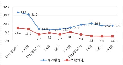 2011年-2013年10月內外銷增速對比