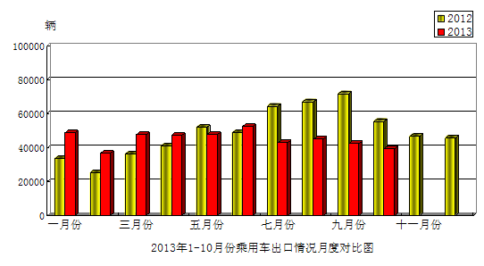 2013年10月份,乘用車出口3.95萬輛,比上月下降了6.47%,比去年同期下降了29.06%創(chuàng)匯金額2.94億美元,比去年同期下降26.30%。其中:小轎車產(chǎn)品出口2.77萬輛,比上月下降了12.70%,比去年同期下降了44.19%;創(chuàng)匯金額1.95億美元,比去年同期下降了45.09%。