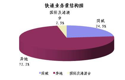 2013年,同城、異地、國際及港澳臺快遞業務收入分別占全部快遞收入的11.5%、57.5%和18.8%;業務量分別占全部快遞業務量的24.9%、72.2%和2.9%。與去年同期相比,同城快遞業務收入的比重上升1.1個百分點,異地快遞業務收入的比重下降2.7個百分點,國際及港澳臺業務收入的比重下降了0.7個百分點。