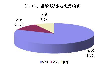 2013年,東、中、西部地區快遞業務收入的比重分別為83.2%、9.2%和7.6%,業務量比重分別為81.3%、10.8%和7.9%。與去年同期相比,東部地區快遞業務收入比重上升了0.9個百分點,快遞業務量比重下降了0.6個百分點;中部地區快遞業務收入比重下降了0.1個百分點,快遞業務量比重上升了0.3個百分點;西部地區快遞業務收入比重下降了0.8個百分點,快遞業務量比重上升了0.3個百分點。