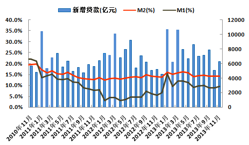 考慮到2013年12月中市場資金利率再度飆升,未來融資放緩的趨緩或難改變。而經濟依舊延續溫和增長、通脹小幅回升,房價壓力有增無減,制約貨幣政策放松。除此之外,12月份有天量的財政放款,加上QE退出政策較為溫和,人民幣升值帶來資金大量流入,加大央行對沖壓力,故貨幣政策延續中性偏緊。