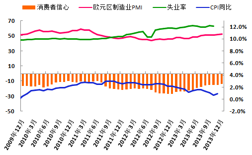 12月份,歐元區17國消費者信心指數小幅回升至-13.6,表明消費者悲觀情緒略有緩解,也暗示歐元區經濟復蘇的跡象對家庭支出產生了積極的影響。