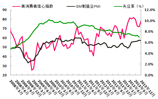 結合近期制造業、房地產、就業等數據,美國經濟強勁復蘇,且經濟和勞動力市場明顯好轉。美聯儲也于2013年12月18日宣布,將每月購債規模削減100億美元,重申接近零的低利率政策,此舉也印證了美聯儲對經濟和就業市場前景的樂觀預期。