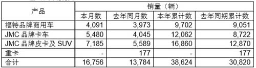 核心提示:江鈴汽車2月銷售16756輛 輕卡同比增長35%江鈴汽車股份有限公司2014年2月產、銷快訊顯示:2月份,江鈴汽車生產福特全順輕客4010輛,同比下降6.59%;前2月累計生產福特全順輕客9160 輛,同比下降7.54%;2月,江鈴汽車生產輕卡5734輛,同比增長36.91%;前2月累計生產12098輛輕卡,同比增長29.45%。