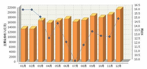 圖2 2013年全國輕工全行業(yè)月度主營業(yè)務(wù)收入及同比增速