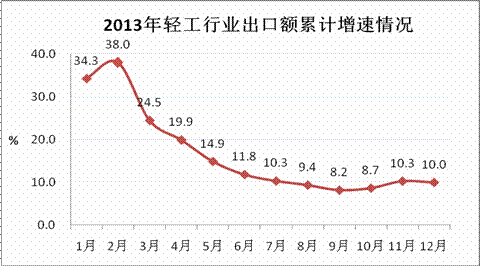 根據(jù)國家統(tǒng)計局?jǐn)?shù)據(jù),2013年1~12月,輕工行業(yè)增加值累計同比增長10.16%,高于全國工業(yè)0.46個百分點,與上年同期基本持平。