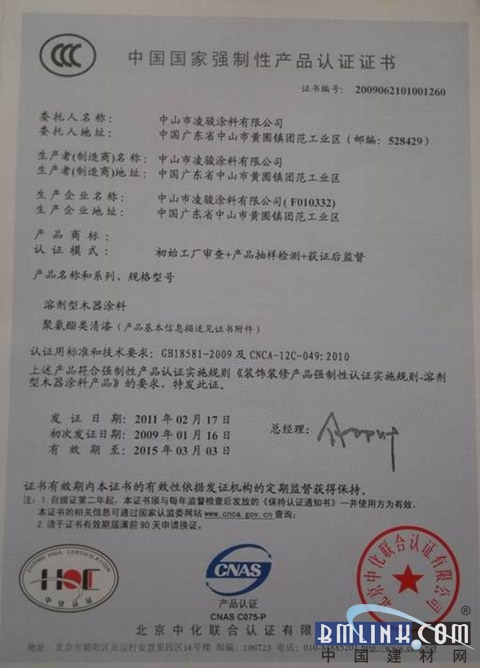 經過專家組嚴格、規范、認真的檢查,中山市凌駿涂料有限公司所生產的莊典漆產品均符合認證標準,能滿足技術、質量、生產等各項要求,產品質量可靠、性能穩定,莊典漆涂料產品全面通過此次3C強制認證,為廣大消費者提供安全放心的油漆涂料。此次莊典漆順利通過3C認證,是莊典漆涂料品牌一直以來對產品質量的高要求和高度重視,始終踐行莊典漆對于生產安全健康可靠產品的企業承諾。中國建材網