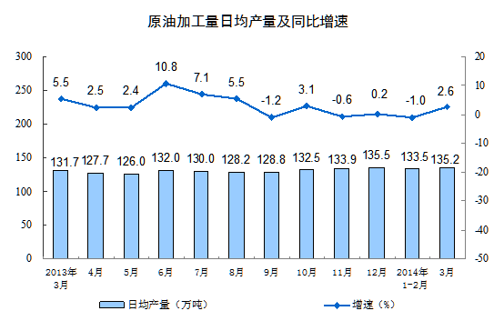 2014年3月我國原油加工量達4192萬噸,與去年同期相比增長2.6%。2014年一季度,全國原油加工量產量累計達12131萬噸,同比增長0.7%。