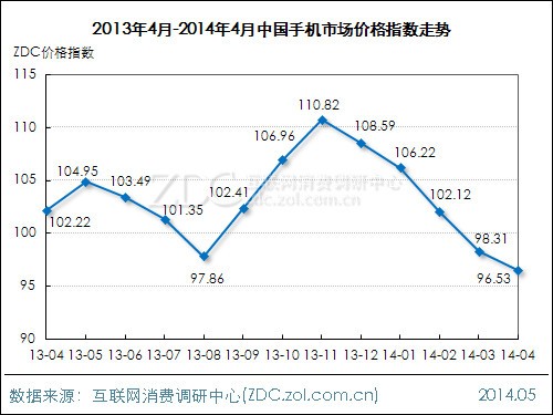2014年4月手機價格指數為96.53點,較上月下降1.78點。這是自2013年11月以來手機價格指數連續第五個月下滑。從一年來的最高點110.82點,下降至一年中最低點。整體來看,手機價格指數在一年內呈現兩次起降,2013年5月為第一個高點,之后連續三個月下滑。