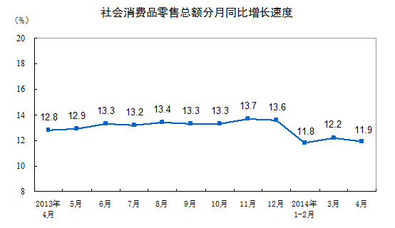 核心提示:2014年4月份社會消費品零售總額增長11.9%1-4月份,社會消費品零售總額81782億元,同比增長12.0%。其中,限額以上單位網上零售額1139.0億元,增長52.0%。