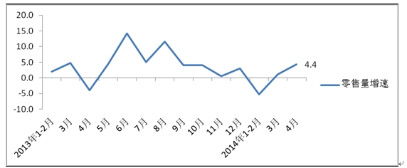 圖2 2013年1月-2014年4月全國百家重點大型零售企業服裝類商品零售量分月同比增速(%)