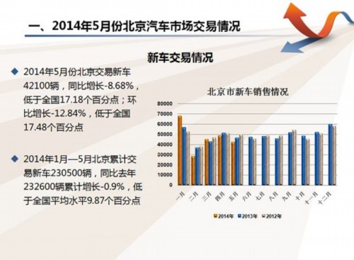 第一、2014年5月份北京交易新車42100輛,同比增長-8.68%,低于全國17.18個百分點;環比增長-12.84%,低于全國17.48個百分點;