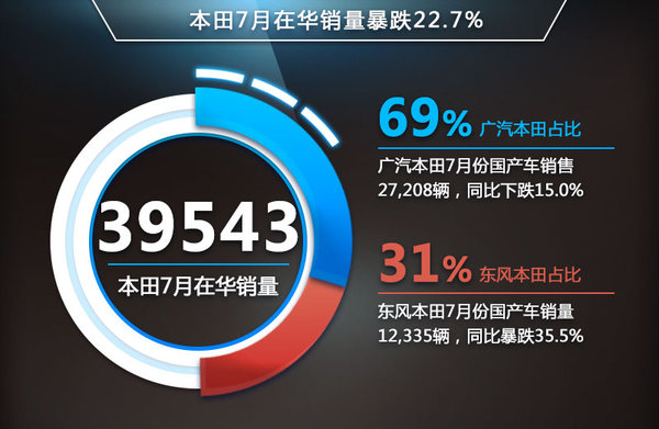 本田7月銷售39543輛,同比下降22.7%,這份銷售單顯然不盡人意。由于雅閣、凌派和CR-V等主力車型銷量同比暴跌,主力車型中只有飛度在7月實(shí)現(xiàn)增長,導(dǎo)致本田總銷量急劇下滑。