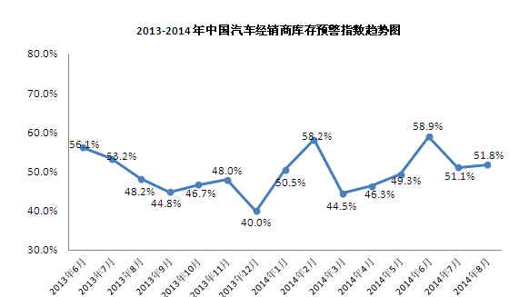 2014年8月的中國汽車經銷商庫存預警指數為51.8%,比上月上升了0.7個百分點,仍超過警戒線水平,基本與上月持平。